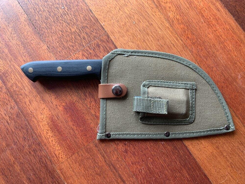 Sheath: The canvas sheath included with the Suji Cleaver (Knife with Accessories) features a durable, rugged design and includes a convenient pocket to hold a small sharpening stone, ensuring you're always ready for a precise cut on the go.